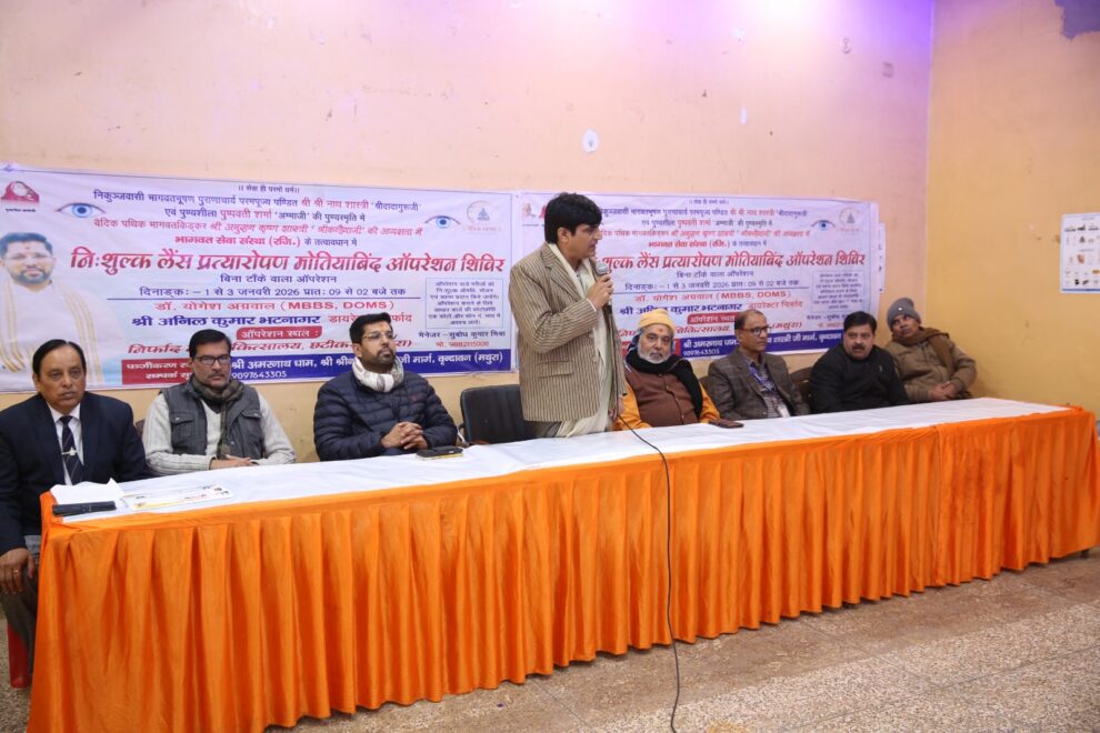 वृन्दावन।गांधी मार्ग स्थित श्रीअमरनाथ धाम में धर्म, आध्यात्म एवं सेवा को समर्पित भागवत एवं संस्था के तत्वाधान में निर्फाद ग्रामीण चिकित्सालय के सहयोग से भारत सरकार के अंधता निवारण कार्यक्रम के अंतर्गत त्रिदिवसीय निःशुल्क नेत्र चिकित्सा शिविर “वैदिक पथिक” भागवत किंकर अनुराग कृष्ण शास्त्री (कन्हैया जी) की अध्यक्षता में संपन्न हुआ।जिसके अन्तर्गत सैकड़ो नेत्र रोगियों के मोतियाबिंद का निशुल्क ऑपरेशन कर उन्हें नेत्र ज्योति प्रदान की गई।